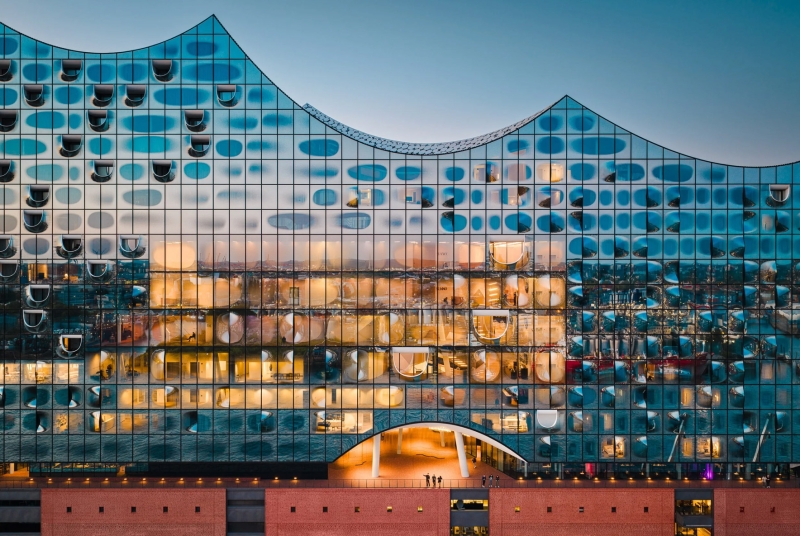Elbphilharmonie in the evening with the Hamburg harbor as a reflection
